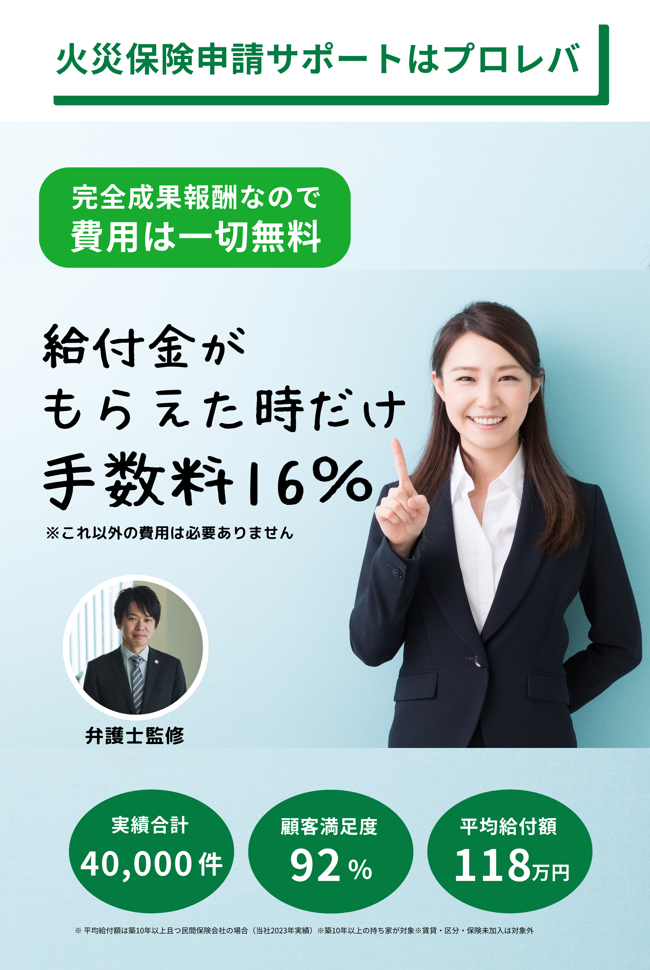 プロレバの実績は累計40,000件にのぼります。熟練の火災保険調査員が、給付金を受け取るまで責任を持って火災保険申請をサポートいたします。さらに、弁護士がサービス全般をサポートしているため、トラブルの心配なく安心してご利用いただけます。